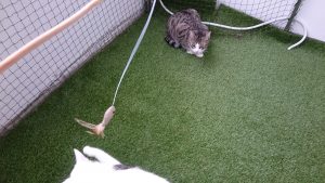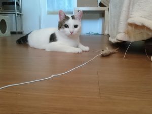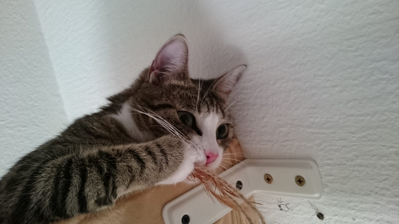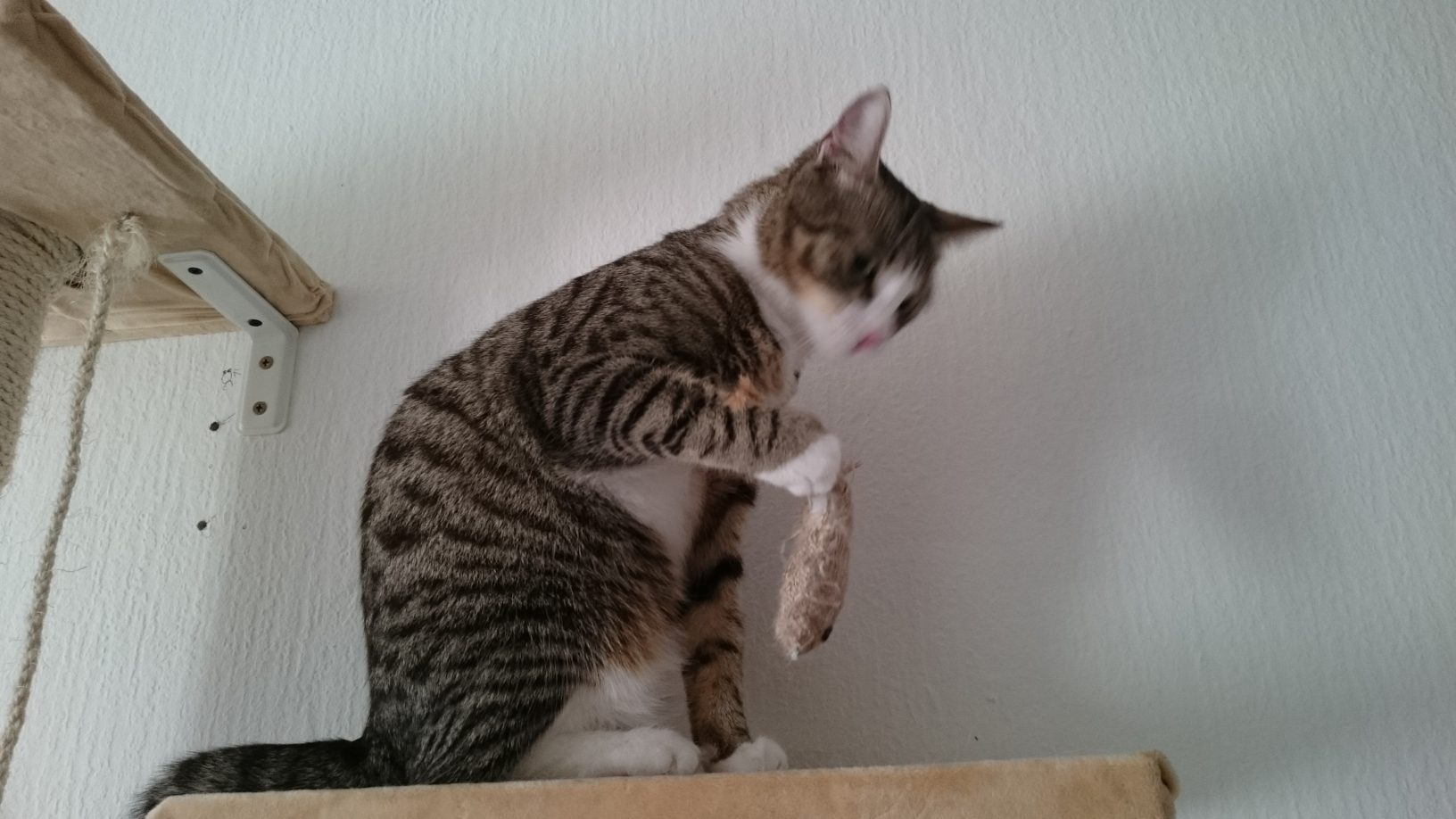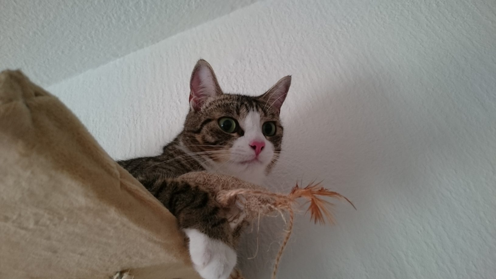 Naja, eigentlich wollte ich nur ein Spielzeug haben, mit dem wir bei den Kleinen mitmachen konnten. Schließlich sind wir viel zu groß und zu schwer um den Kratzbaum oder Sessel rauf zu toben – und das war bei den Mädchen, die gerade mal einen Monat bei uns waren, schwer angesagt.