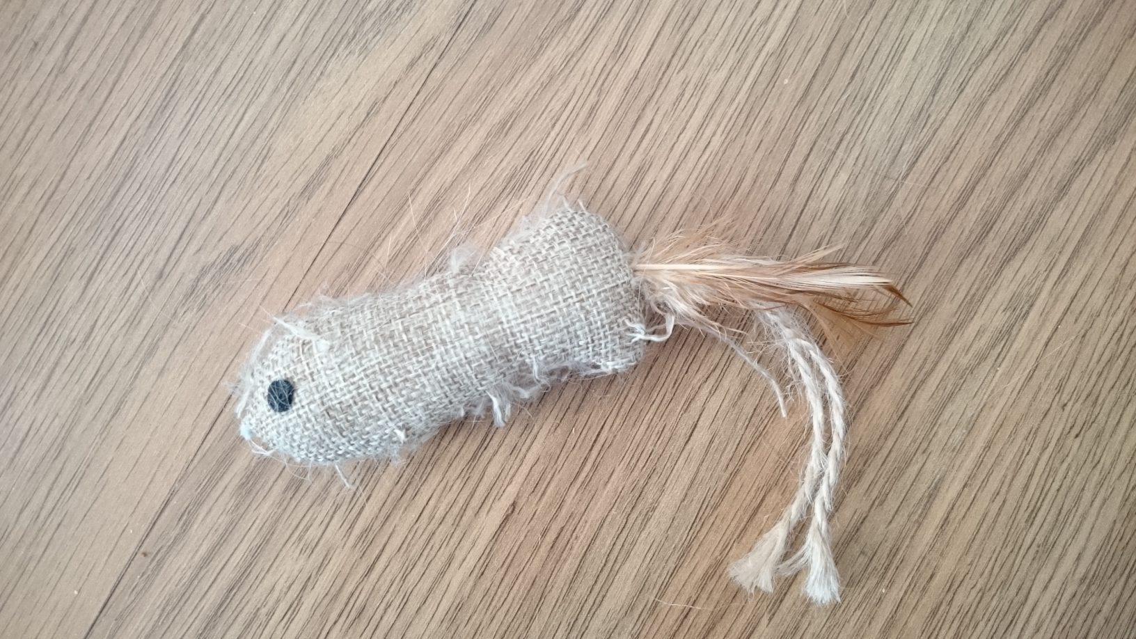 Und dann plötzlich, auf unserer wöchentlichen Einkaufstour, eigentlich nur aus einer Laune heraus, gingen wir mal wieder am Katzenregal vorbei. Und dort hing er, der Jute-Fisch, 8 cm lang, mit Watte gefüllt, ein gesticktes Auge auf jeder Seite und Federn als Schwanz – und das gleich dreimal! Selbstverständlich haben wir alle Fische gekauft, die wir kriegen konnten, wer weiß, wann es die wieder gibt!
