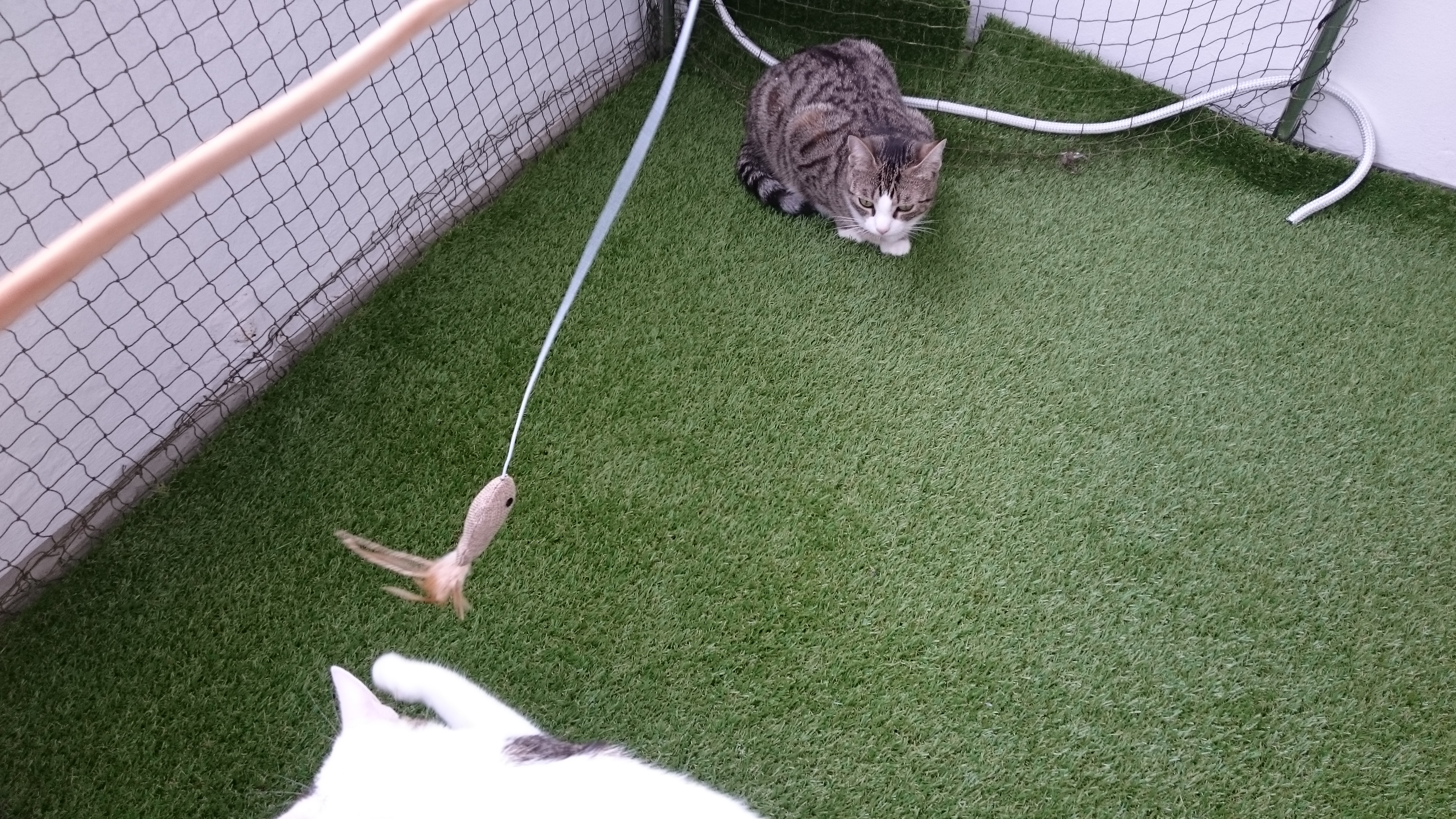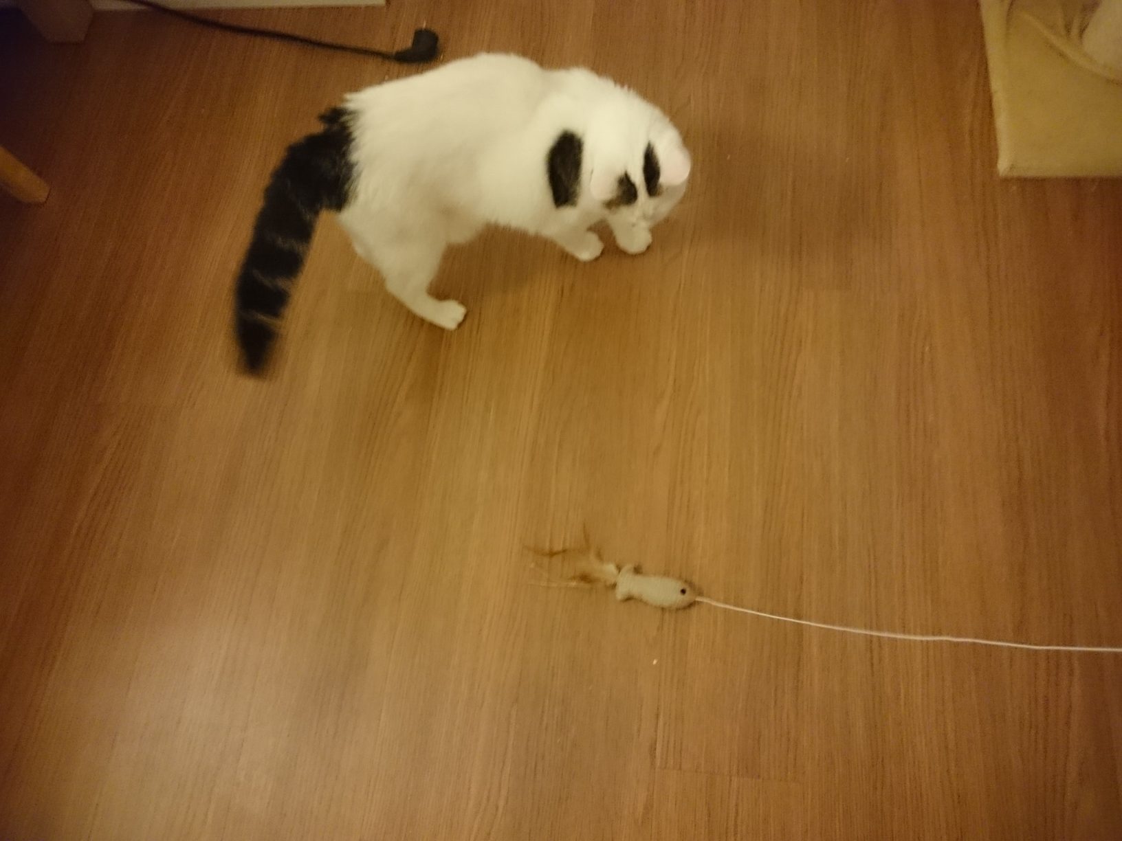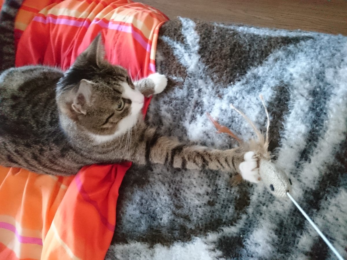 Das liebste Spielzeug unserer kleinen Mädchen ist die Katzenangel mit einem Fisch dran.