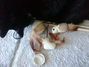 Vor ca. einem Jahr war ich mit meiner Mutter im Supermarkt. Es war eines jener Geschäfte, in denen man vom Apfel über Wurst und Käse auch Haushaltswaren bis hin zu Kleidung und Schuhen erstehen kann. Natürlich gab es hier auch ein recht großzügiges Regal mit Katzenspielzeug… Und dort vor diesem Supermarktregal begann das Drama: Ich hatte damals eine Katzenangel gekauft. Zum „interaktiven Spielen“ mit den Mädchen.