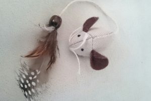 Bommel ist Willi sehr ähnlich: Jute mit Watte gefüllt, zwei aufgestickte Knopfäuglein, ein Schnurrbärtchen und Federn am Schwanz.  Aber der Schwanz ist viel länger und hat eine Holzperle am Ende, die interessante Geräusche macht, wenn sie auf dem Fußboden aufkommt.