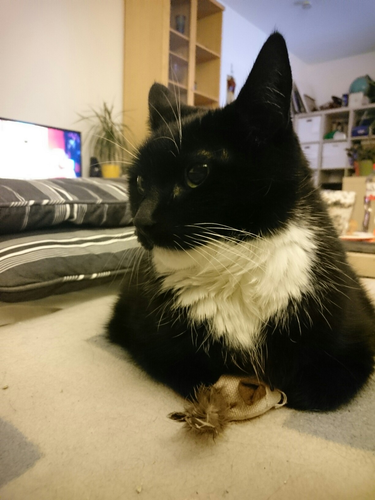 Aber wenn wir mit einer Maus klappern oder mit der Katzenangel wackeln, zeigt sie eindeutig Interesse. Und wenn sie einen guten Tag hat, macht sie ordentlich mit.