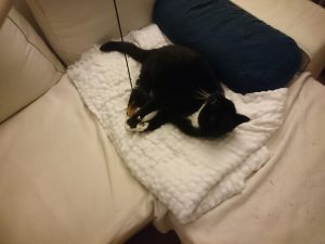 Je nachdem, auf welcher Seite des Sofas sie es sich gerade gemütlich macht, Moppel ist bei ihr. Sie liegt auf ihm, hat ihn im Arm und leckt ihn auch manchmal ab. Gerade nachts, wenn sie alleine bleiben muss, hat sie so etwas bei sich, dass sie lieb hat.
